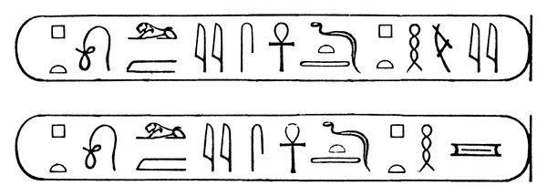 *Oval bir döngü ile etrafı çevrili bir dizi hiyeroglifin kral isimlerini vurguladığı keşfedilmişti. Bunlara Fransızca ‘fişek’ anlamına gelen ‘cartouche’ (kartuş) adı verilmişti. “18. yüzyıl Fransız topçularının silahlarını doldurduğu sosis şeklindeki barut ve mermi bohçasına” benzerliği bu adın kullanılmasına ilham olmuştur.