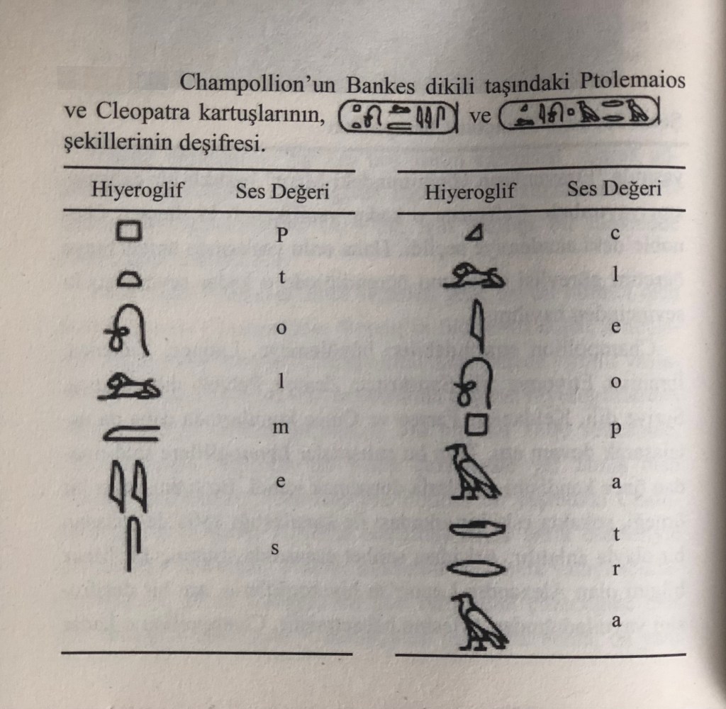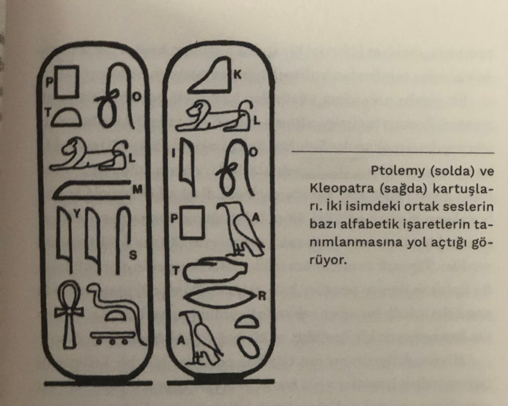 Görsel, Hilary Wilson “Hiyeroglifleri Anlamak” kitabından. Ptolemy ve Kleopatra kartuşlarında “T” sesi birbirinden farklı işaretlerle gösterilmiştir. Kleopatra kartuşundaki “t” sesi artık “d” olarak kabul edilir. Diğerinden kısmen daha yumuşak telaffuz edilir.